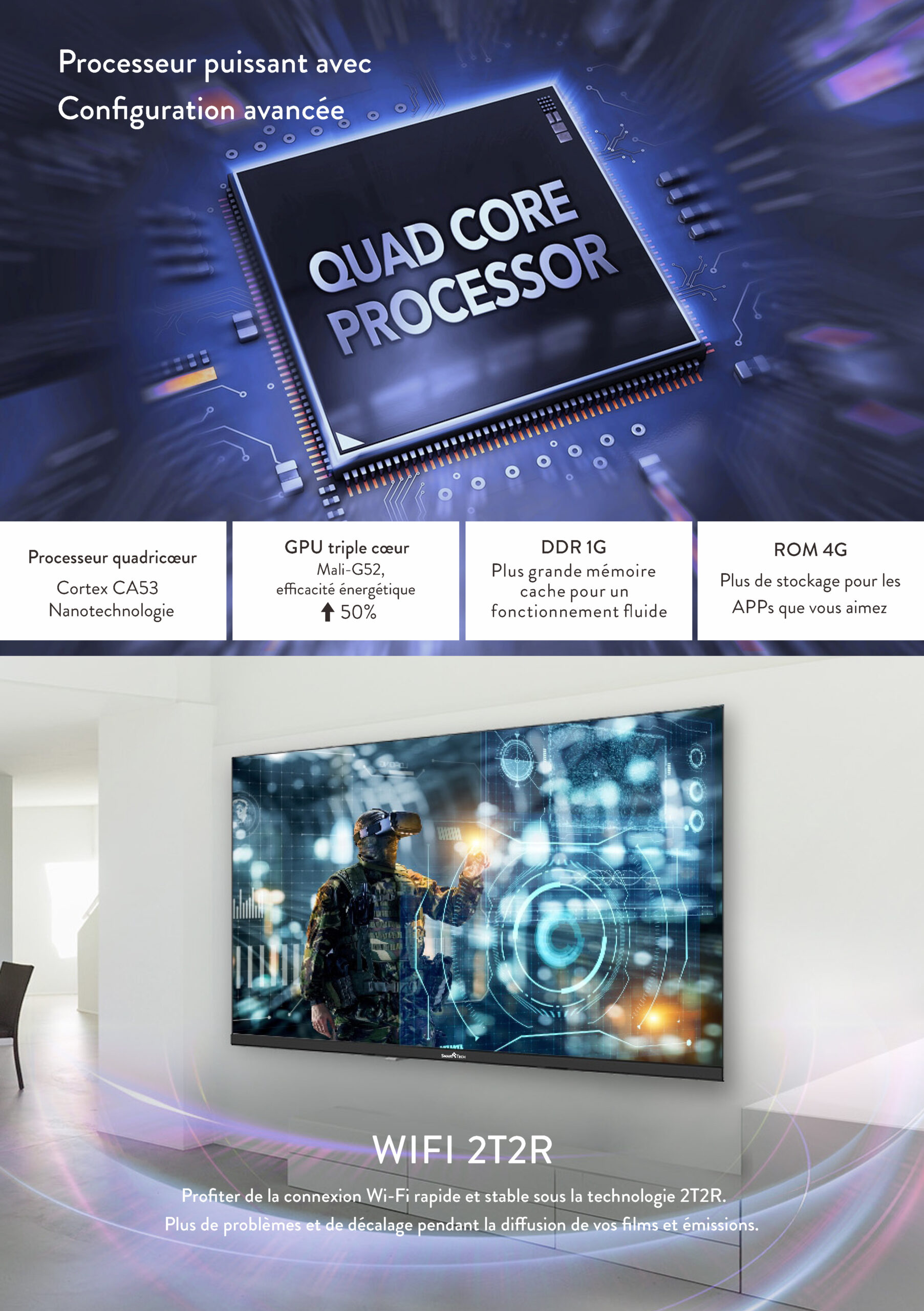 • Wifi, Processeur Quad core