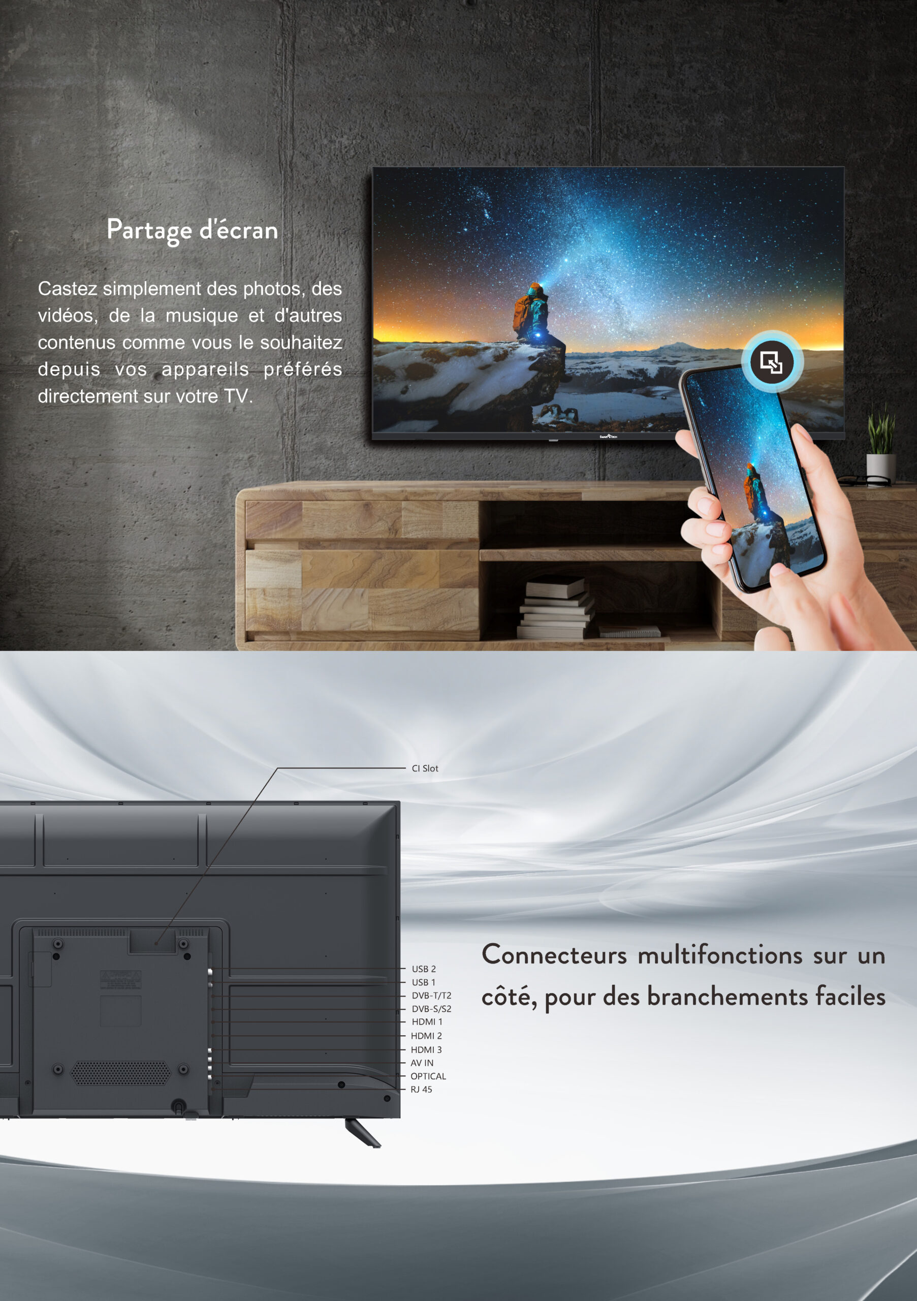 • Pre-installed applications: Molotov, Netflix, Prime Video, Disney+, YouTube, Plex -