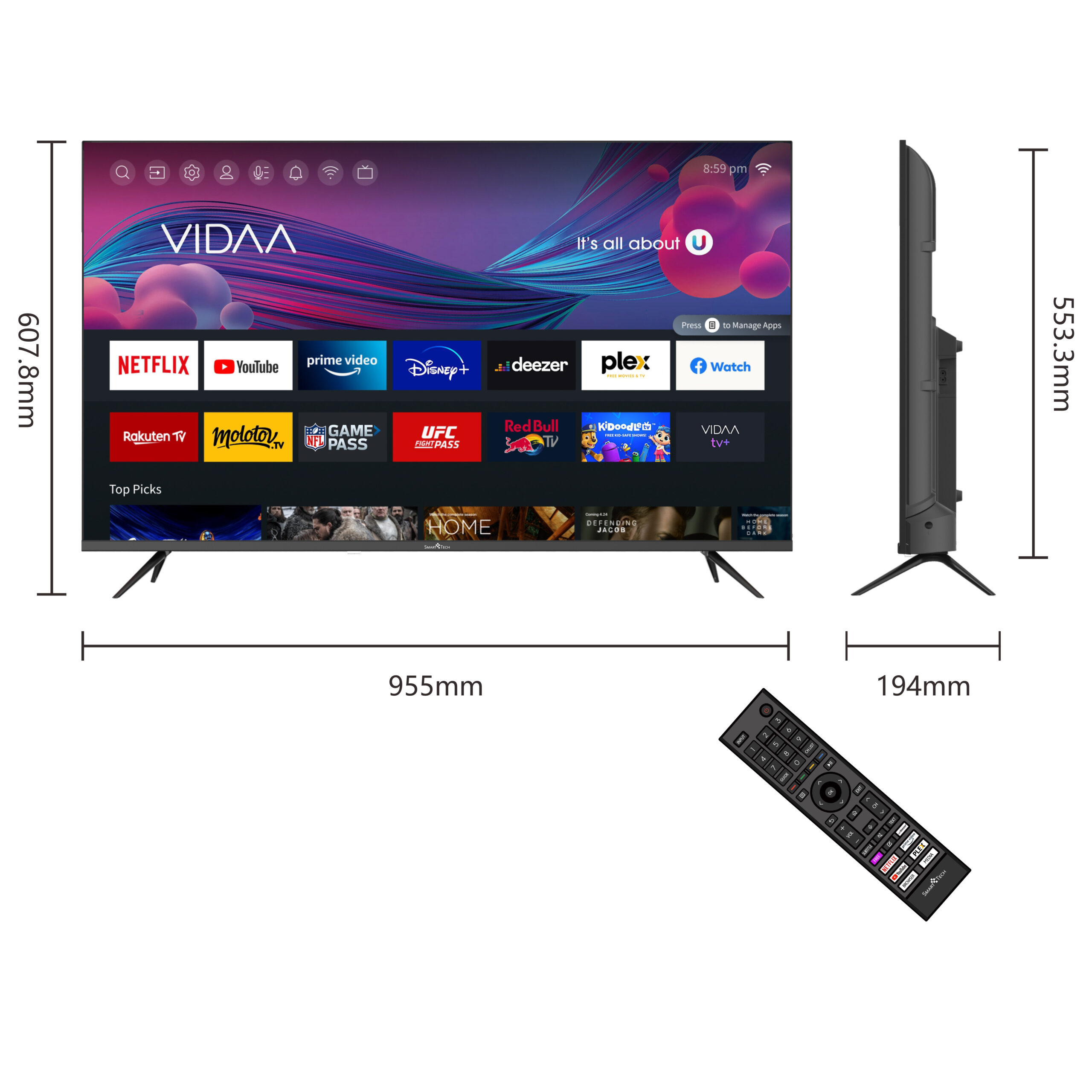 | Net size with stand (W x H x D in mm) | 955*607.8*194 | ||